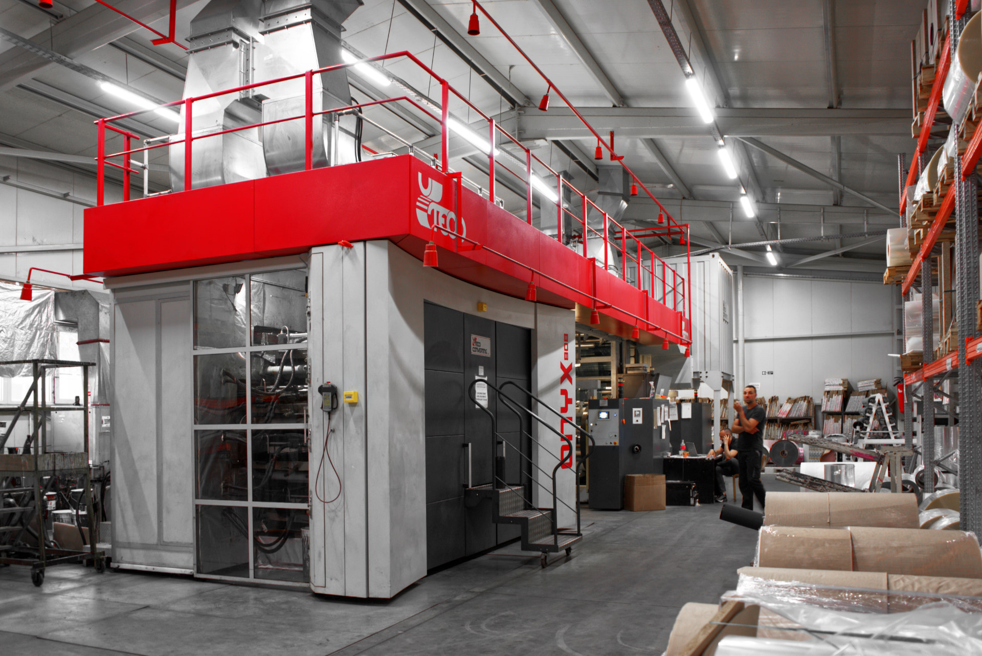 Линия за покриване, съответно пластифициране и ламиниране на хартия. Процесът на пластифициране се осъществява чрез екструзия на полиетилен (PE).
